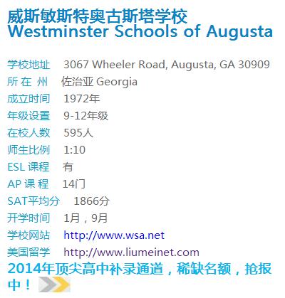 威斯敏斯特奥古斯塔学校 Westminster Schools of Augusta 位于佐治亚亚特兰大周围,当地社区环境非常好,是佐治亚著名的优质高中。该校的理工科课程非常突出,提供高水平计算机课程,科学奥林匹克小组在2012年度地区竞赛中取得第一名的好成绩。学校的合唱团和英文竞赛成绩也很突出。SAT1830.