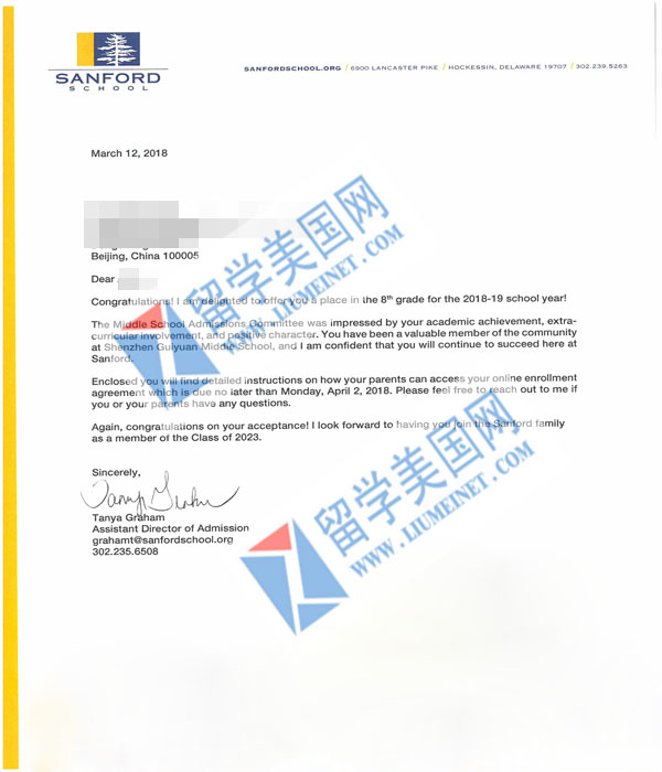 恭喜W同学成功获得 Sanford School 录取offer!留美网又一同学拿到顶尖高中录取offer在这里恭喜W同学,祝愿W同学在美国学业有成!展翅高飞!想申请美国留学的同学马上咨询:400-000-7805,010-65183908,微信:liumeinet2014