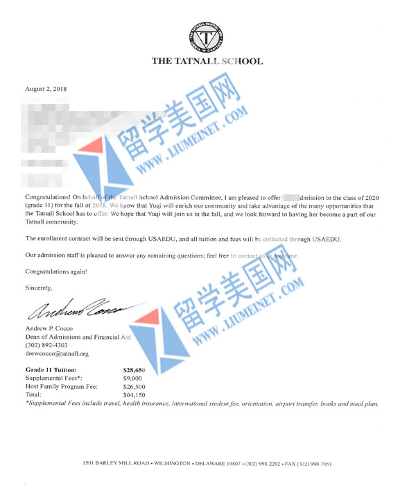 恭喜留美网同学成功补录到东部顶尖走读塔特龙学校---The tatnall school