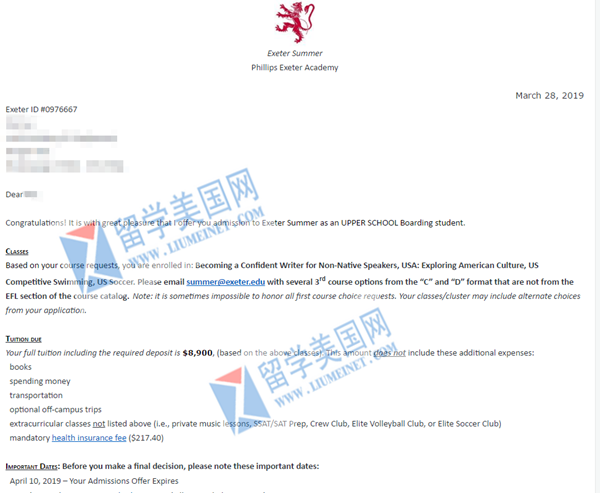 Phillips Exeter Academy夏校offer展示: