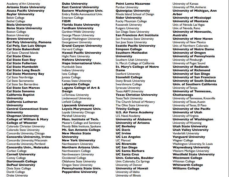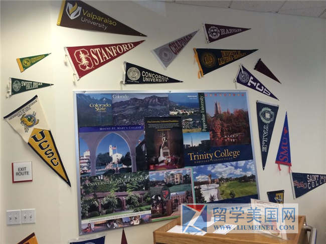 学校学生毕业去向大学展墙。下图是学校2009-2012年升学去向,粗体代表最近学生就读学校,有杜克大学、布朗大学、威廉姆斯学院、康奈尔大学、达特茅斯大学,UC各个分校,等等。