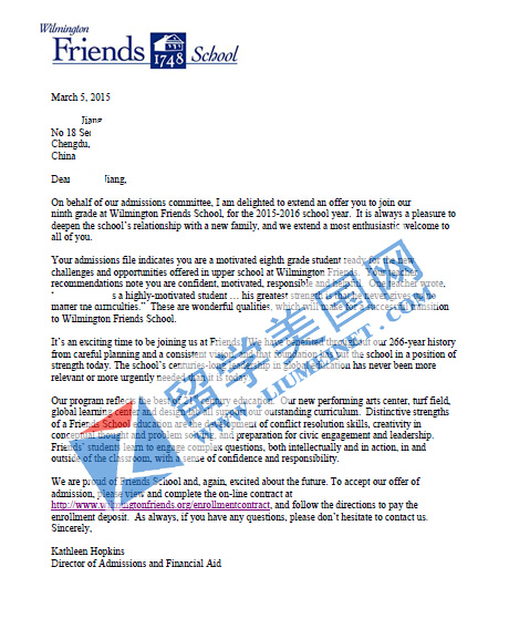 恭喜JRL获东部顶尖威明顿友好高中录取!