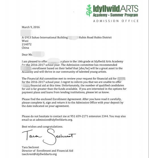 好消息,留学美国网又一同学获得了理想学校的offer。今天,留学美国网XKQ同学等到了期盼已久的 Idyllwild Arts Academy 艾迪怀德艺术高中的offer,便第一时间和留美网分享她的喜悦,感谢留美网老师为她所做的一切。