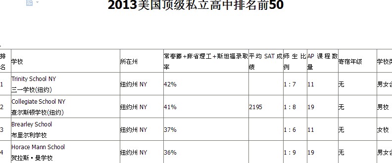 注:这个排名是美国某权威网站根据学校的藤校录取率,sat平均分等条件综合选出的top50高中。