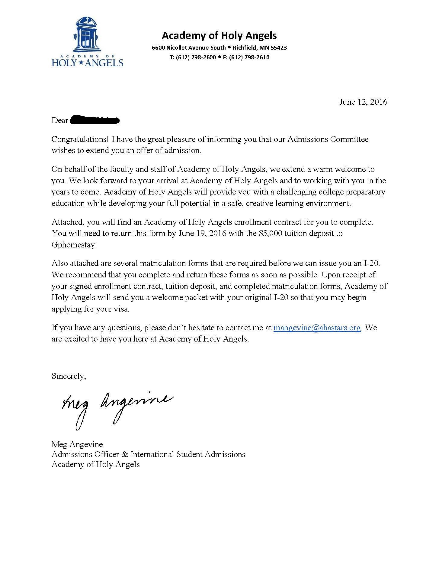 唐同学对学校的要求比较高,我们选了两所学校,唐同学很满意。由于唐同学在澳洲,有很多不便。但是我们克服了种种困难,以非常高的效率完成了申请。很快圣天使发来了录取通知。最终唐同学选择了圣天使。